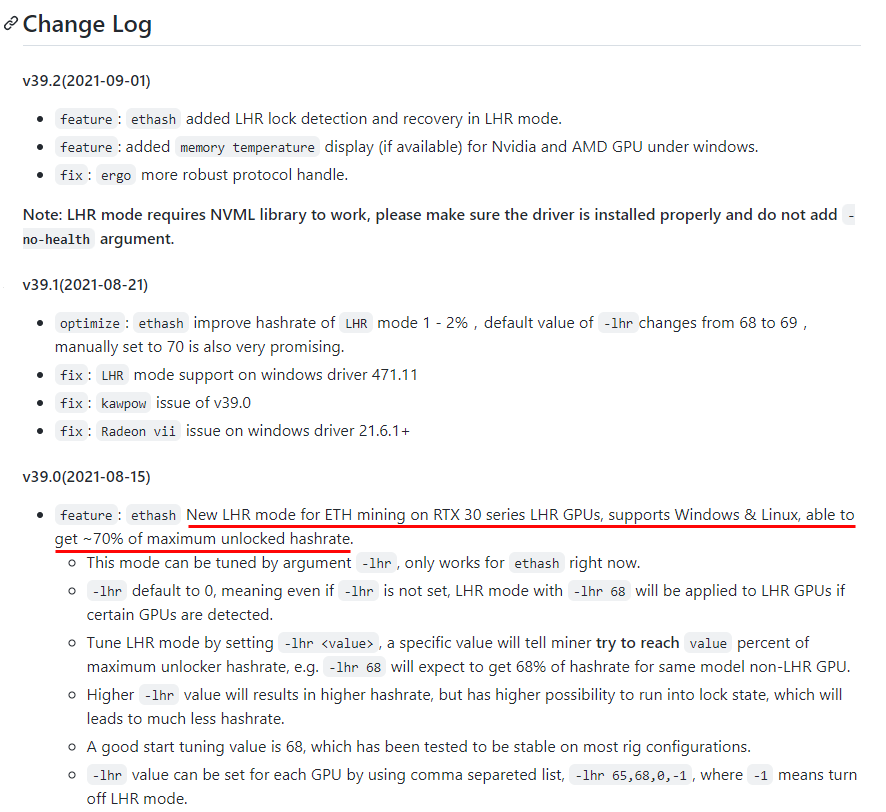 Change Log를 보면 , 2021년 8월 15일부터 LHR mode에서 이더리움 마이닝의 70%까지의 성능으로 해쉬 언락이 가능하다고 써있다.